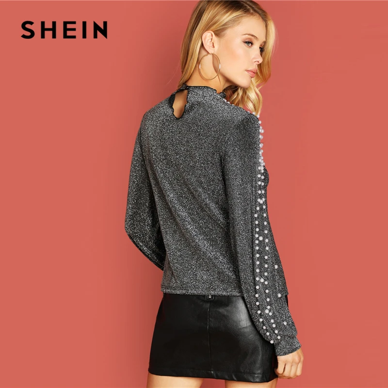 Buy SHEIN Going Out Silver Modern Lady Pearl Beading Bishop Sleeve Glitter op Women Autumn Plain Minima