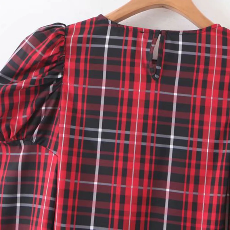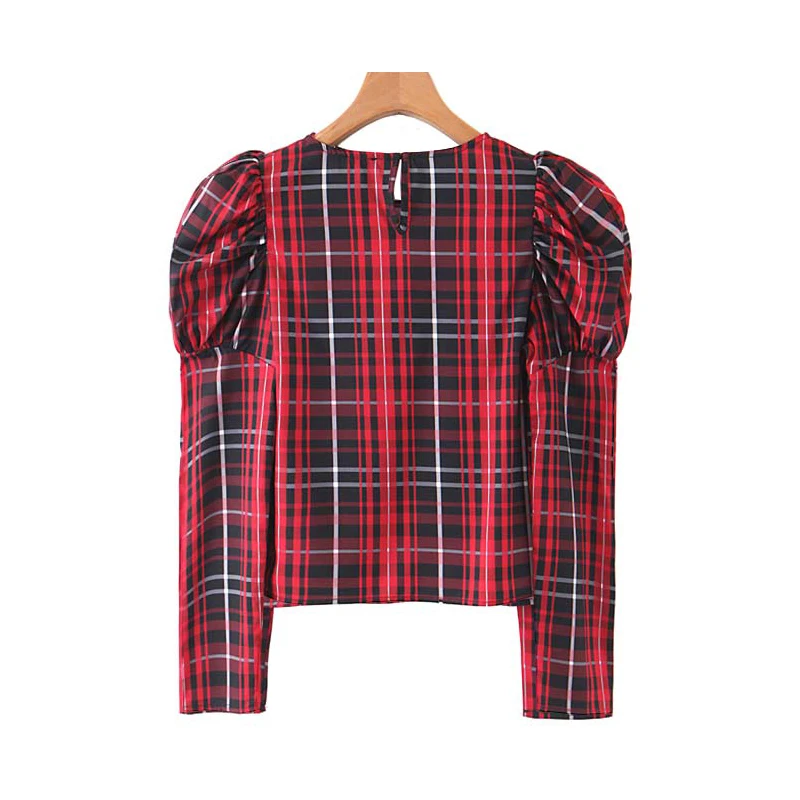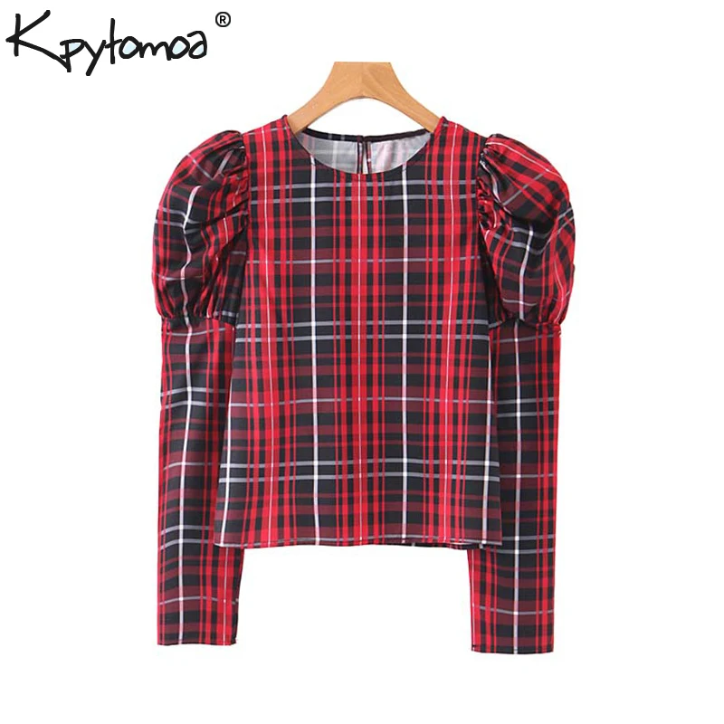 Best Vintage Stylish Plaid Blouses Women 2019 Fashion O Neck Long Puff Sleeve Elegant Shirts Chic Tops B